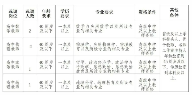 (4)具有一本及以上學(xué)歷,其中省級(jí)及以上學(xué)科帶頭人、骨干教師、名師工作室主持人放寬到本科及以上;具有選調(diào)崗位所需的專(zhuān)業(yè)或任職資格、職業(yè)(執(zhí)業(yè))及技能要求,近三年年度履職考核結(jié)果均為合格及其以上,身體健康。