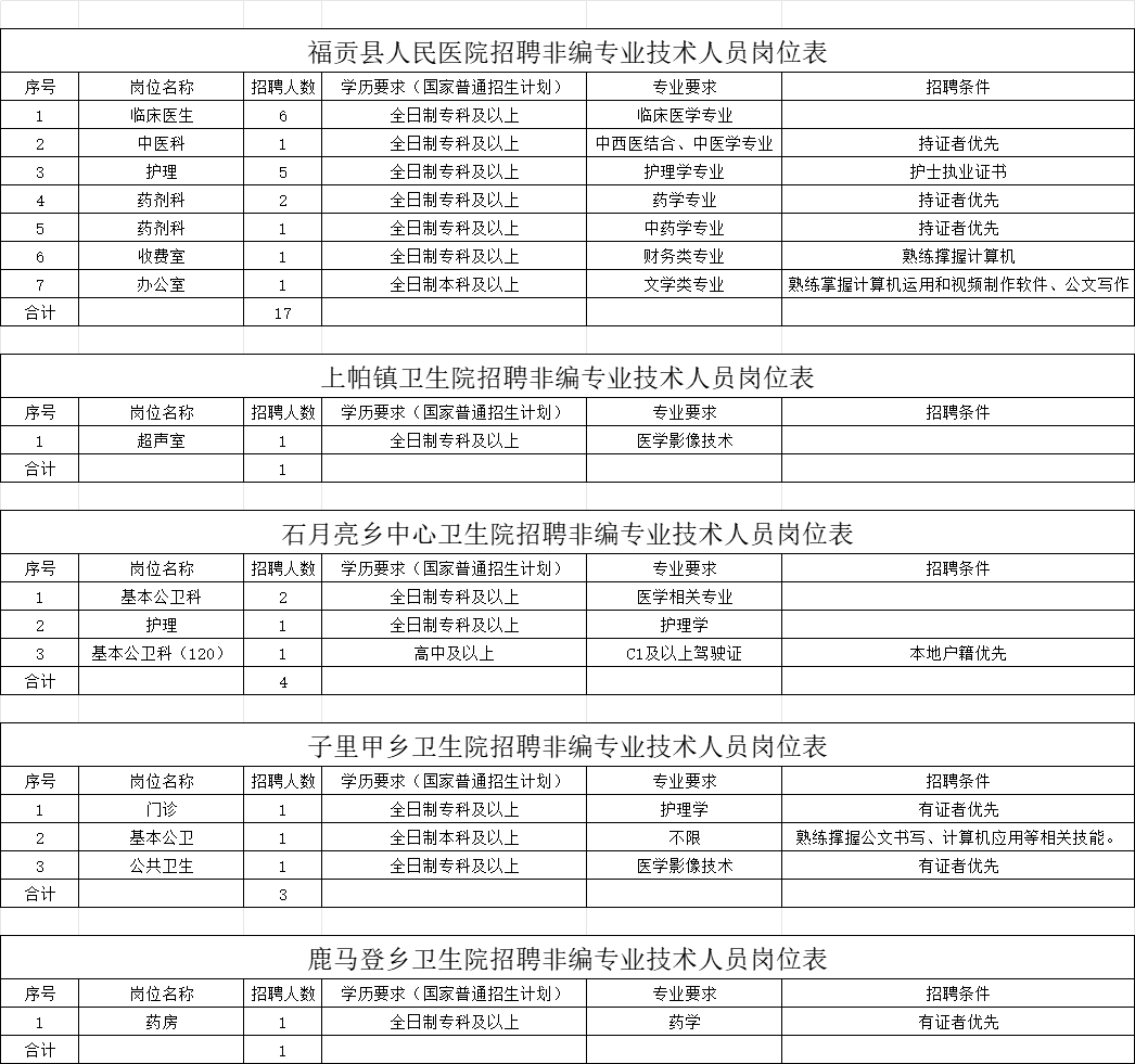 福貢縣人民醫(yī)院擬招聘專業(yè)技術(shù)人員17名;上帕鎮(zhèn)衛(wèi)生院擬招聘專業(yè)技術(shù)人員1名,石月亮鄉(xiāng)中心衛(wèi)生院擬招聘4名(住宿安排);鹿馬登鄉(xiāng)衛(wèi)生院擬招聘1名(住宿安排房租自理);子里甲鄉(xiāng)衛(wèi)生院擬招聘3名(住宿安排)。