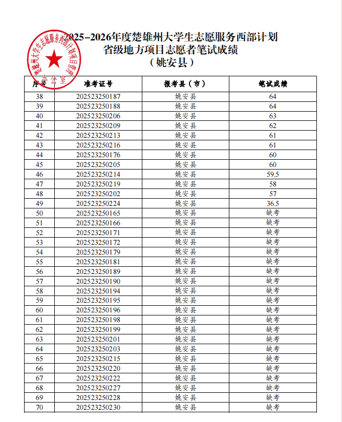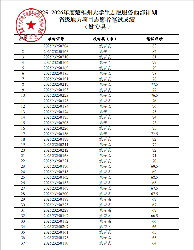 根據(jù)共青團云南省委、云南省教育廳、云南省財政廳、云南省人力資源和社會保障廳《關(guān)于印發(fā)〈2025—2026年度云南省大學(xué)生志愿服務(wù)西部計劃實施方案〉的通知》和云南省大學(xué)生志愿服務(wù)西部計劃項目管理辦公室《關(guān)于做好2025—2026年度云南省大學(xué)生志愿服務(wù)西部計劃地方項目志愿者招募派遣工作的通知》要求,楚雄州大學(xué)生志愿服務(wù)西部計劃項目管理辦公室于2025年6月14日下午統(tǒng)一組織了志愿者筆試,現(xiàn)將2025—2026年度楚雄州姚安縣大學(xué)生志愿服務(wù)西部計劃地方項目志愿者筆試成績予以公告。
