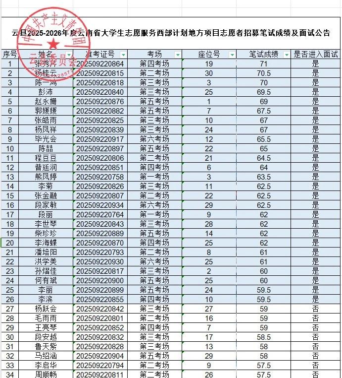 云縣2025-2026年度云南省大學(xué)生志愿服務(wù)西部計(jì)劃地方項(xiàng)目志愿者筆試相關(guān)工作已結(jié)束,現(xiàn)將筆試成績進(jìn)行公示。