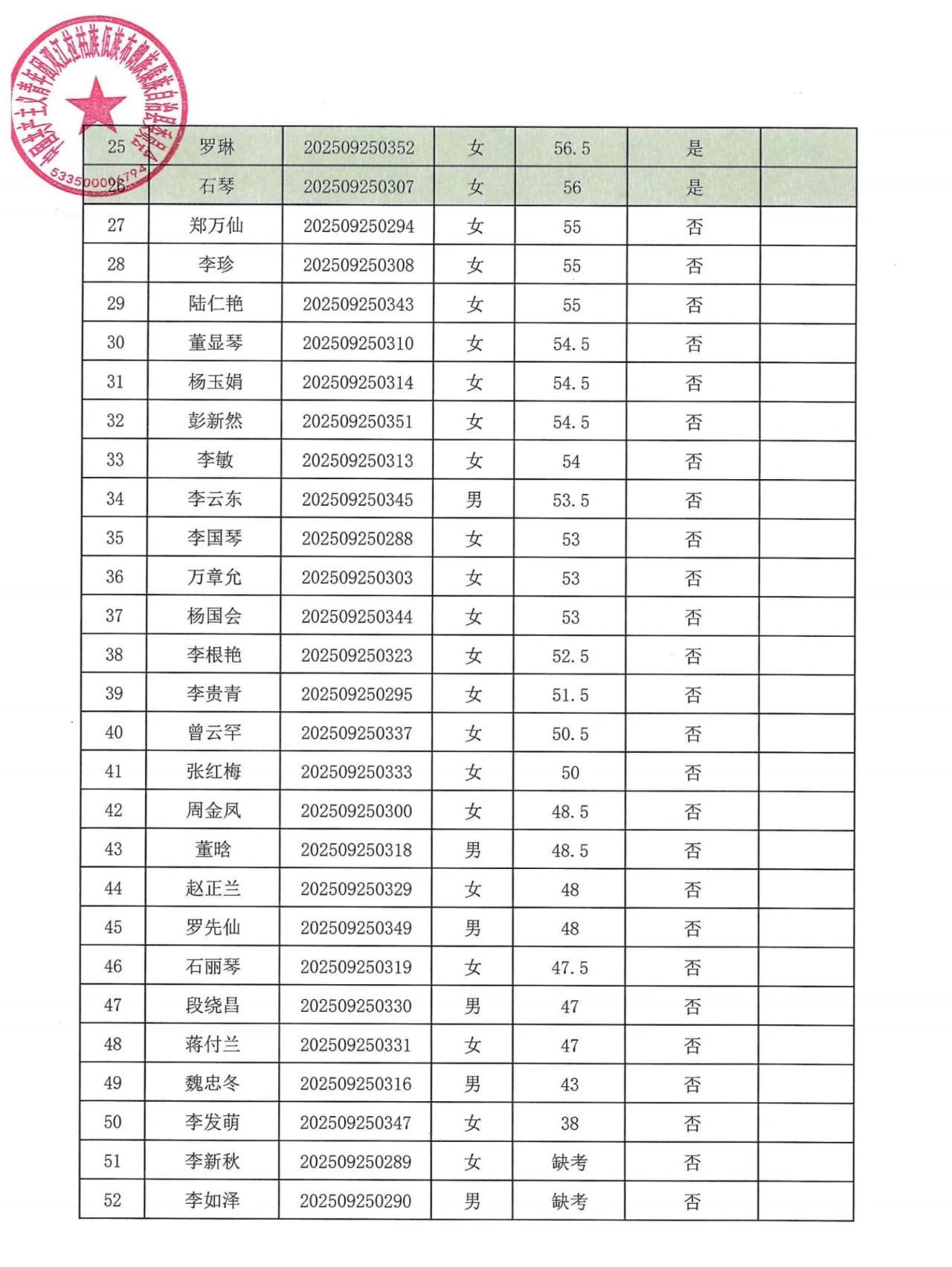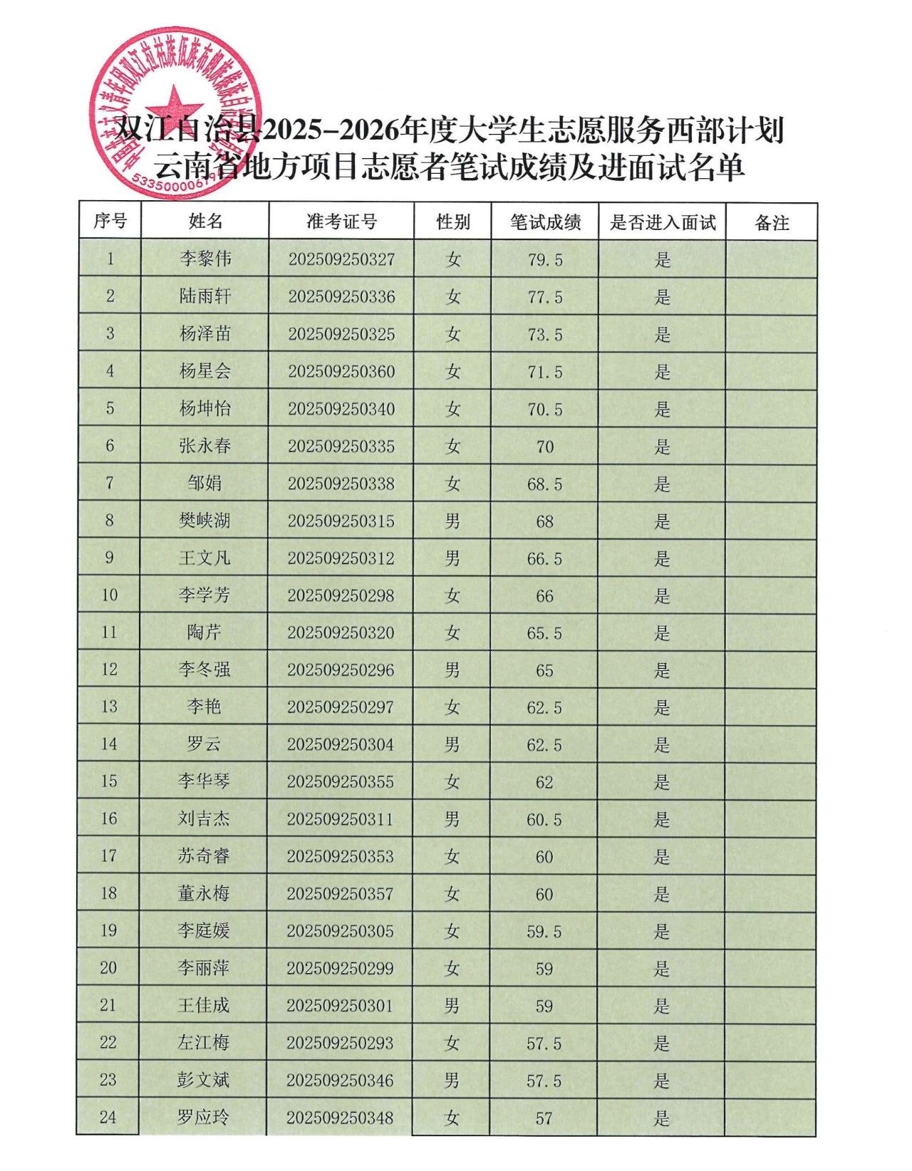 雙江自治縣2025—2026年度大學生志愿服務西部計劃云南省地方項目志愿者筆試成績及進入面試名單: