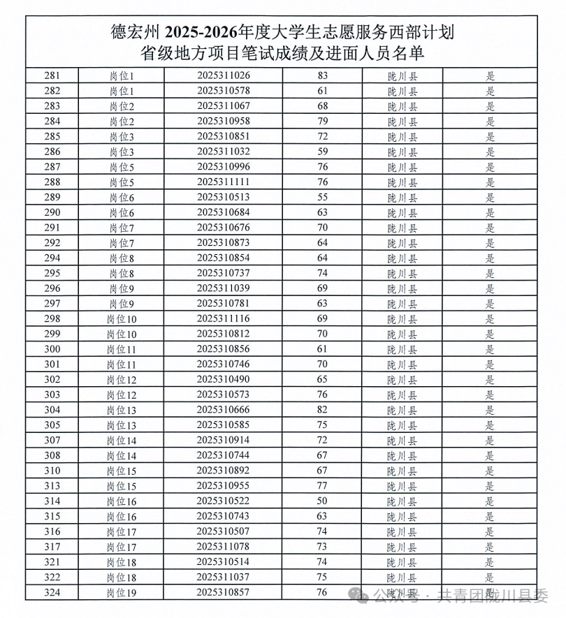 根據(jù)《共青團(tuán)云南省委 云南省教育廳 云南省財(cái)政廳 云南省人力資源和社會(huì)保障廳關(guān)于印發(fā)〈2025—2026年度云南省大學(xué)生志愿服務(wù)西部計(jì)劃實(shí)施方案〉的通知》和《云南省大學(xué)生志愿服務(wù)西部計(jì)劃項(xiàng)目管理辦公室關(guān)于做好2025—2026年度云南省大學(xué)生志愿服務(wù)西部計(jì)劃地方項(xiàng)目志愿者招募派遣工作的通知》要求,現(xiàn)將隴川縣2025—2026年度大學(xué)生志愿服務(wù)西部計(jì)劃省級(jí)地方項(xiàng)目招募資格復(fù)審及面試有關(guān)事項(xiàng)公告如下: