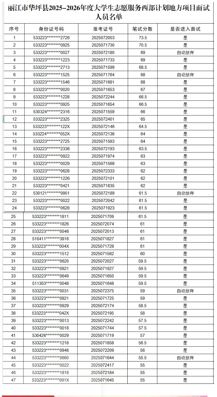 根據(jù)麗江市西部計(jì)劃項(xiàng)目辦關(guān)于開展2025-2026年度云南省大學(xué)生志愿服務(wù)西部計(jì)劃省級地方項(xiàng)目的有關(guān)要求,按報(bào)考崗位筆試成績從高到低的順序,以招考計(jì)劃數(shù)1:2的比例,確定參加面試人選,現(xiàn)將面試有關(guān)事項(xiàng)公告如下: