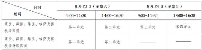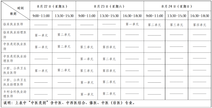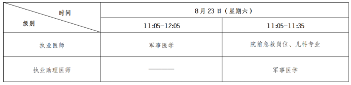 考試實行計算機化考試,軍隊現役人員加試軍事醫(yī)學、院前急救崗位和兒科專業(yè)加試相應內容。中醫(yī)類別藏醫(yī)專業(yè)實行紙筆考試。考試時間如下: