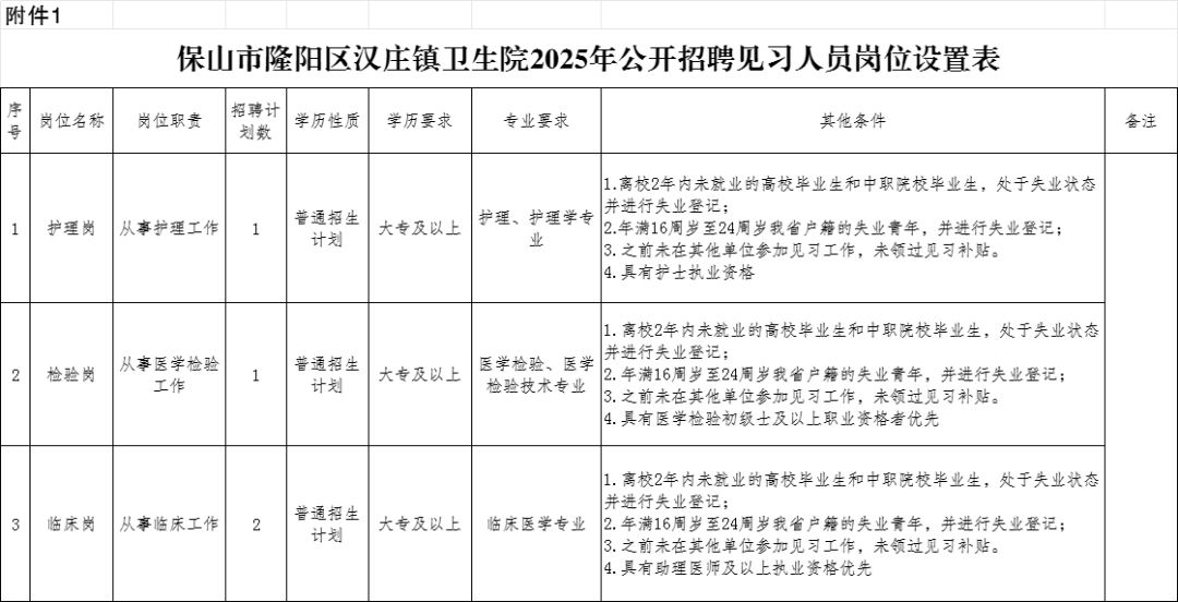附件:附件1.隆陽區(qū)漢莊鎮(zhèn)衛(wèi)生院2025年公開招聘見習(xí)人員崗位設(shè)置表.xlsx