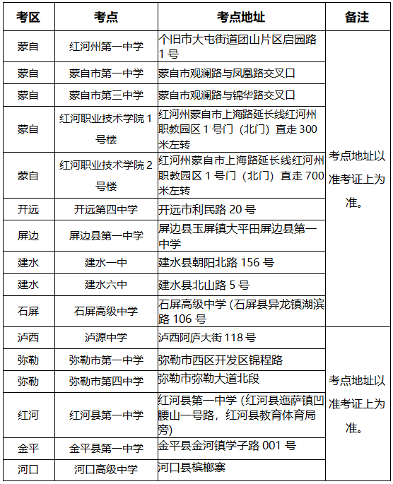 考試期間,紅河州招生考試辦公室將設(shè)立舉報(bào)箱和舉報(bào)電話,舉報(bào)箱設(shè)在紅河州教育體育局,地址:州行政辦公中心C區(qū)5樓,舉報(bào)電話:0873-3732960。各考區(qū)咨詢舉報(bào)電話:開(kāi)遠(yuǎn)市0873-7123392、蒙自市0873—3856940、屏邊縣0873-3224636、建水縣0873-7613224、石屏縣0873-4857250、彌勒市0873-6122374、瀘西縣0873-6621391、紅河縣0873-4621222、金平縣0873-5224335、河口縣0873-3456522,3451413。