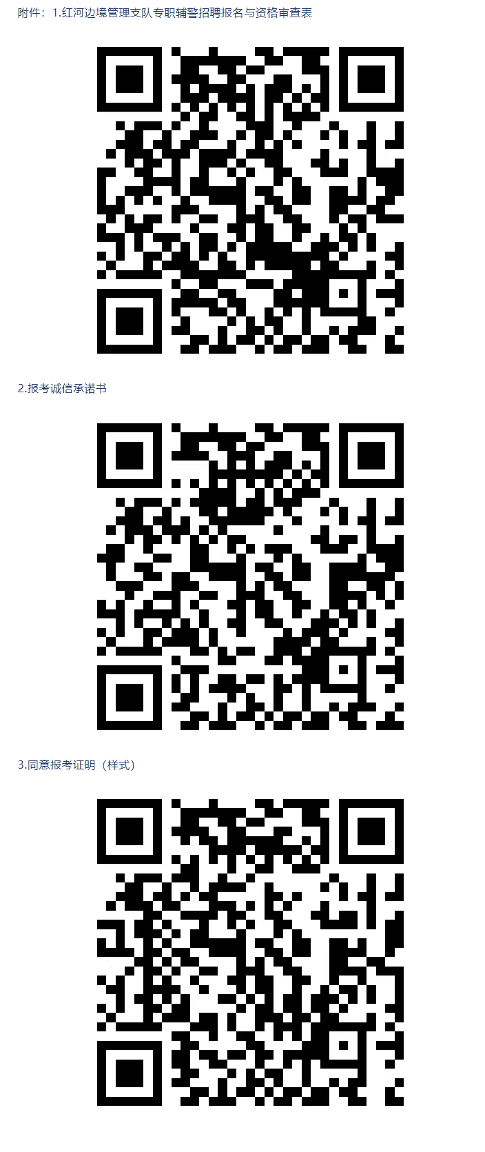 (2)報(bào)名時(shí)需提交《紅河邊境管理支隊(duì)專(zhuān)職輔警招聘報(bào)名與資格審查表》(見(jiàn)附件1,粘貼近期免冠半寸彩色照片)一式一份,攜帶本人身份證、戶口本、畢業(yè)證、征信報(bào)告、報(bào)考誠(chéng)信承諾書(shū)(見(jiàn)附件2)、單位同意報(bào)考證明(見(jiàn)附件3,無(wú)工作單位的不提供)以及優(yōu)先招聘條件所需的其他證明材料原件及復(fù)印件1份。