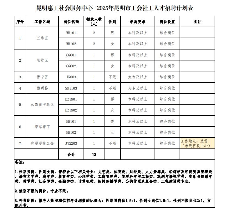 面向社會公開招聘合同制工會社會工作人員13名。具體崗位詳見《昆明惠工社會服務中心2025年工會社工人才招聘計劃表》(附件1)。