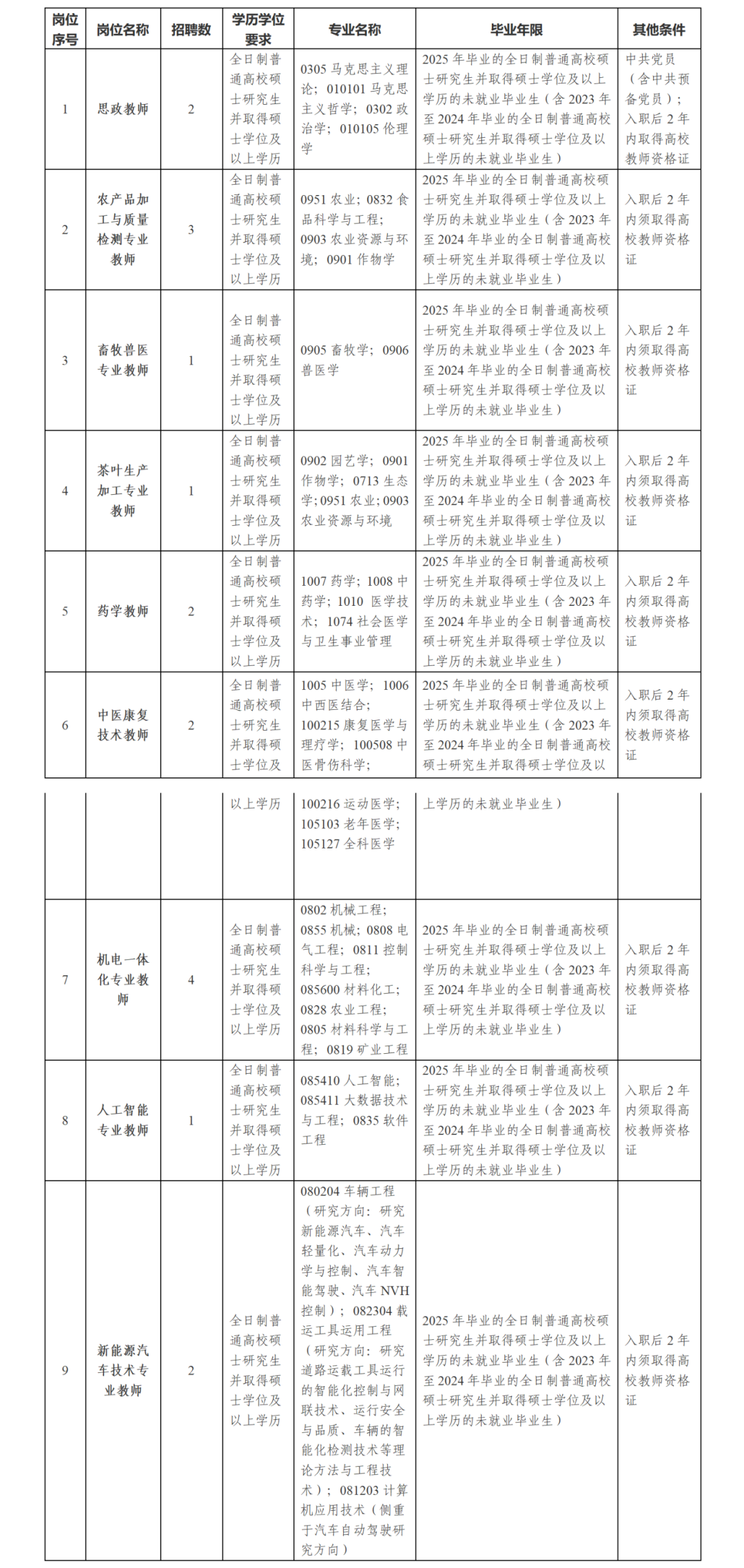 引進18名事業(yè)編制教師,其中,思政教師2名,農(nóng)產(chǎn)品加工與質(zhì)量檢測專業(yè)教師3名,畜牧獸醫(yī)專業(yè)教師1名,茶葉生產(chǎn)加工專業(yè)教師1名,藥學教師2名,中醫(yī)康復技術教師2名,機電一體化專業(yè)教師4名,人工智能專業(yè)教師1名,新能源汽車技術專業(yè)教師2名。