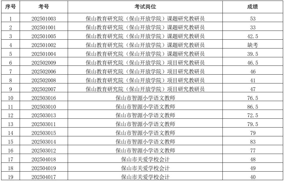 按照《2025年保山市教育體育局所屬部分事業(yè)單位公開遴選專業(yè)技術(shù)人員公告》,現(xiàn)將2025年保山市教育體育局所屬部分事業(yè)單位公開遴選專業(yè)技術(shù)人員筆試成績及筆試合格分?jǐn)?shù)線公告如下:
