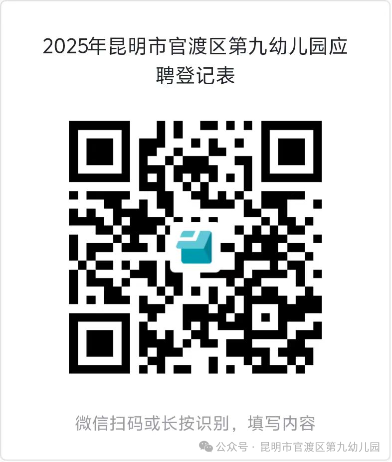 報(bào)名采取網(wǎng)絡(luò)方式進(jìn)行,點(diǎn)擊下面鏈接或掃描二維碼進(jìn)入《2025年官渡區(qū)第九幼兒園應(yīng)聘登記表》網(wǎng)頁后,如實(shí)填寫個人相關(guān)信息,上傳應(yīng)聘所需材料進(jìn)行報(bào)名,點(diǎn)擊“提交”后則報(bào)名完成。