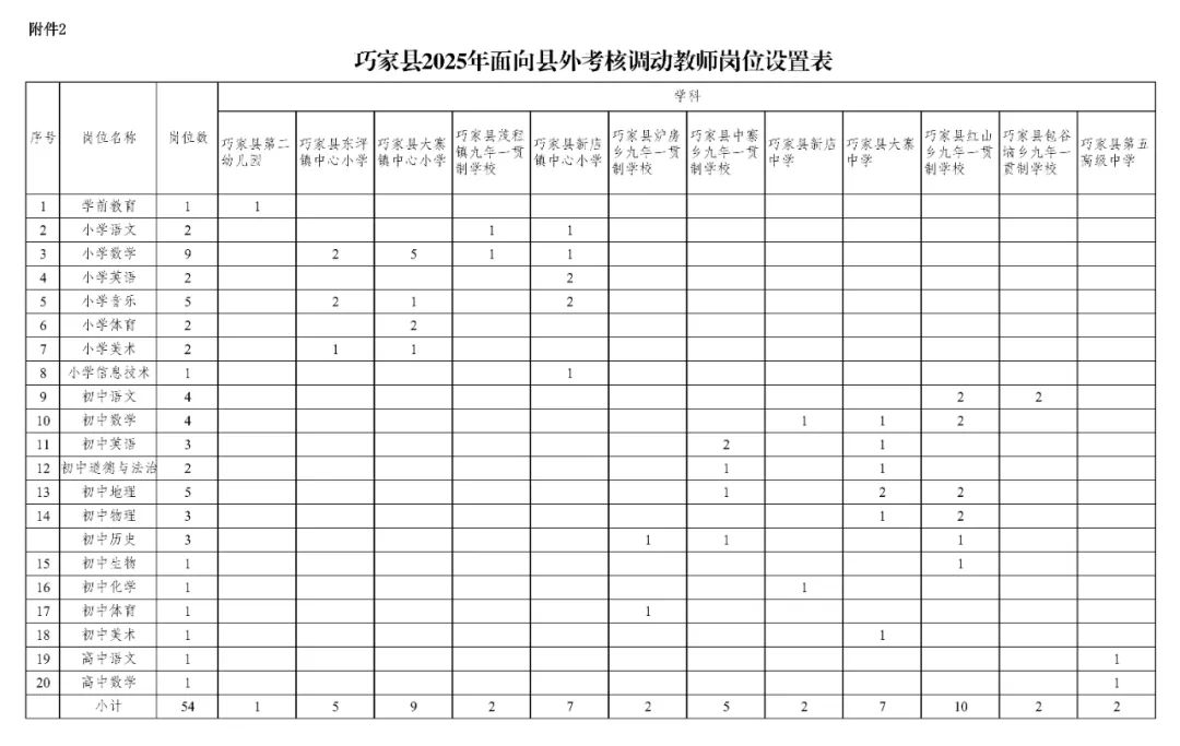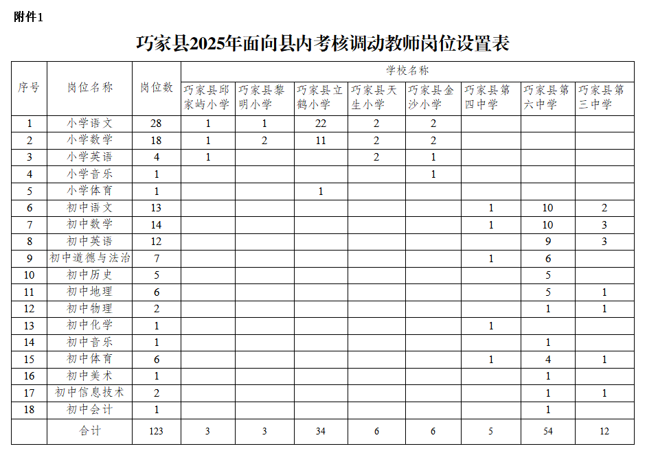 本次計劃考核調動縣內教師123名、縣外教師54名,共計177名。具體崗位設置詳見《巧家縣2025年面向縣內考核調動教師崗位設置表》(附件1)、《巧家縣2025年面向縣外考核調動教師崗位設置表》(附件2)。