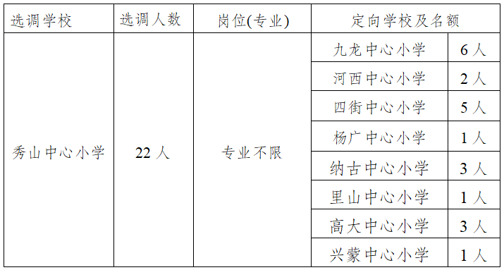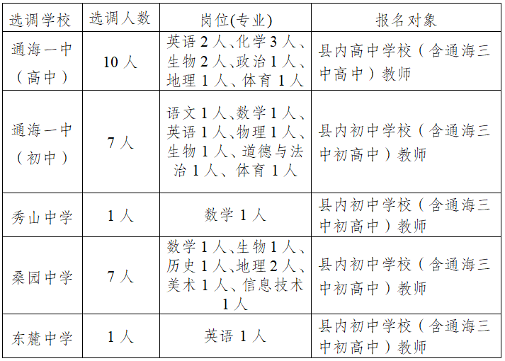 按照中共通海縣委編制委員會(huì)下達(dá)的編制使用計(jì)劃,2025年通??h教育體育系統(tǒng)擬在本系統(tǒng)內(nèi)公開(kāi)定向選調(diào)高中教師10人、初中教師16人、小學(xué)教師22人,選調(diào)崗位、人數(shù)及相關(guān)要求如下: