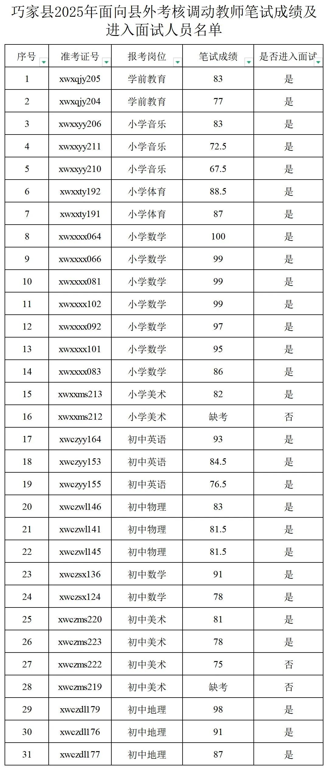 2.巧家縣2025年面向縣外考核調(diào)動教師筆試成績及進入面試人員名單