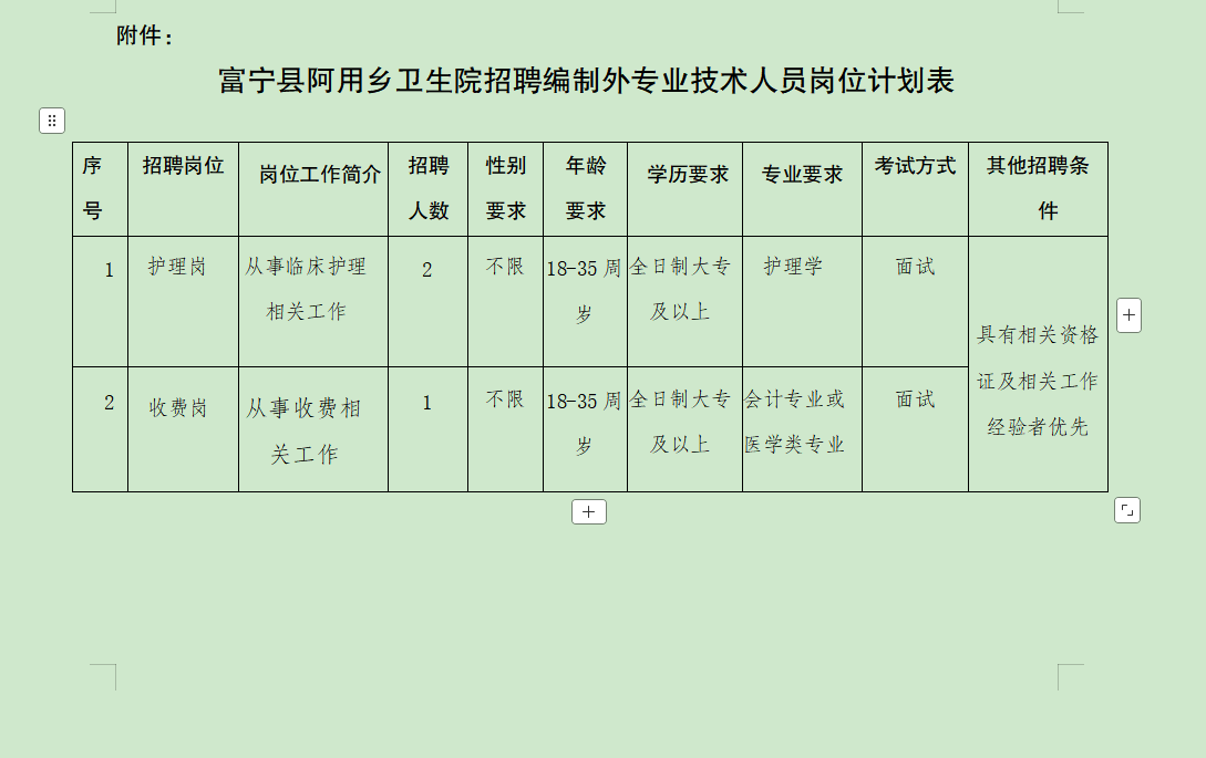 此次招聘編制外工作人員3名,具體崗位、人數(shù)、資格條件等詳見(jiàn)附件《富寧縣阿用鄉(xiāng)衛(wèi)生院招聘編制外專(zhuān)業(yè)技術(shù)人員崗位計(jì)劃表》