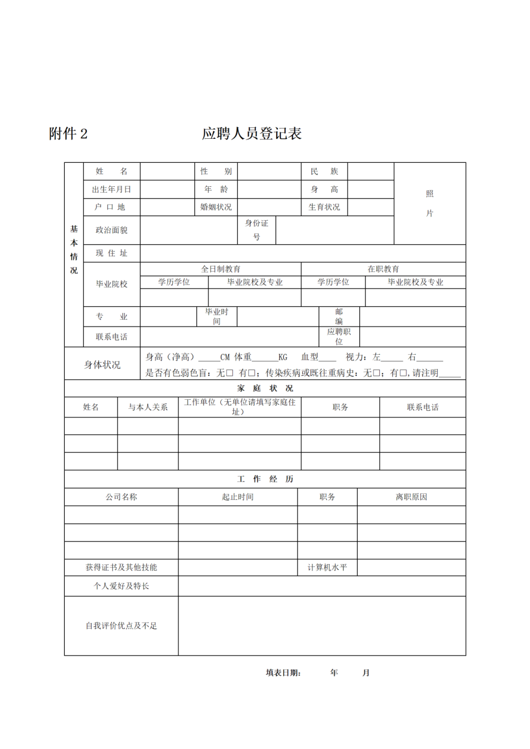 4.報(bào)名材料:報(bào)考人員需提供本人身份證、學(xué)歷學(xué)位證書(shū)、相關(guān)資格證書(shū)原件及復(fù)印件,近期一寸彩色免冠照片1張,報(bào)考資格條件相關(guān)資料,如實(shí)填寫(xiě)的《應(yīng)聘人員登記表》(附件2)。
