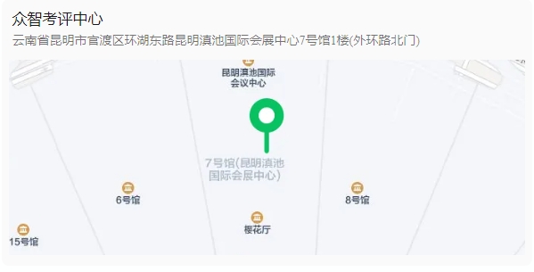 昆明市官渡區(qū)環(huán)湖東路滇池國際會展中心7號館北門外環(huán)路1樓(云南眾智考評中心)