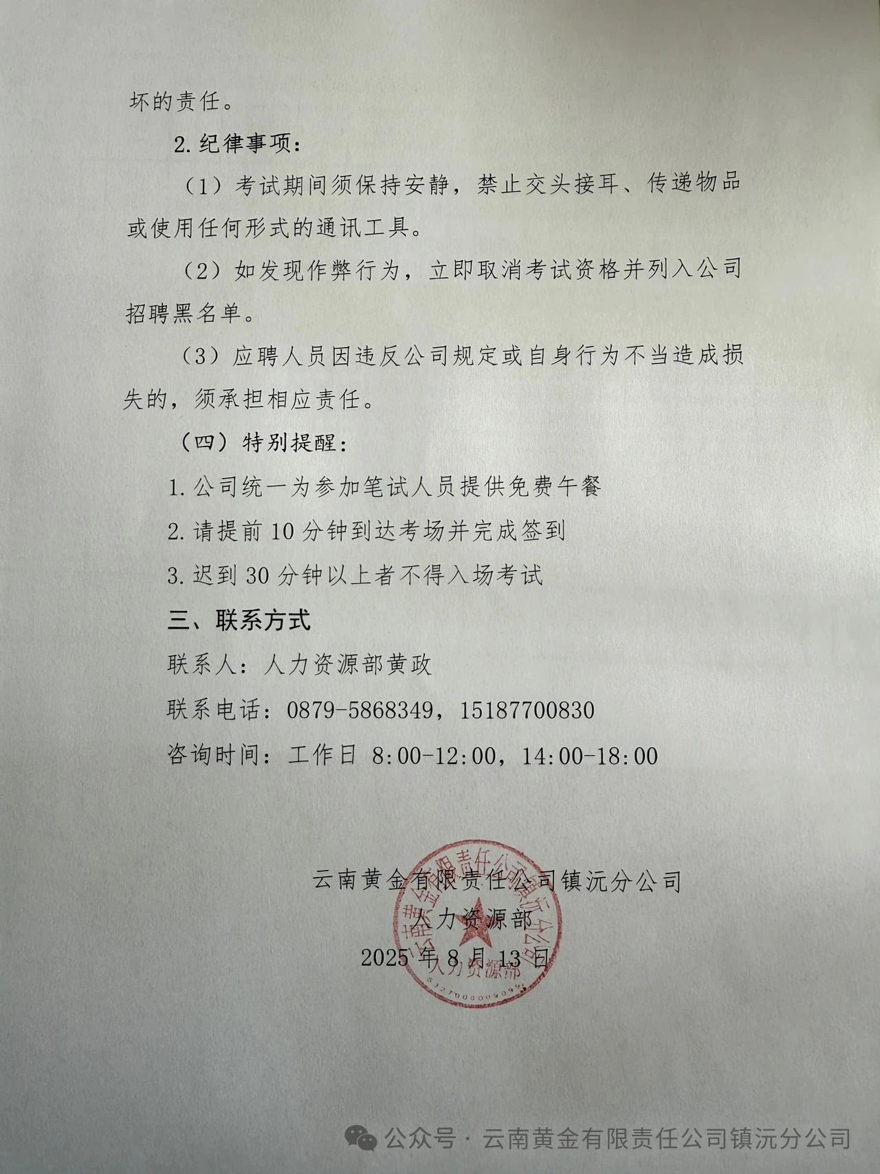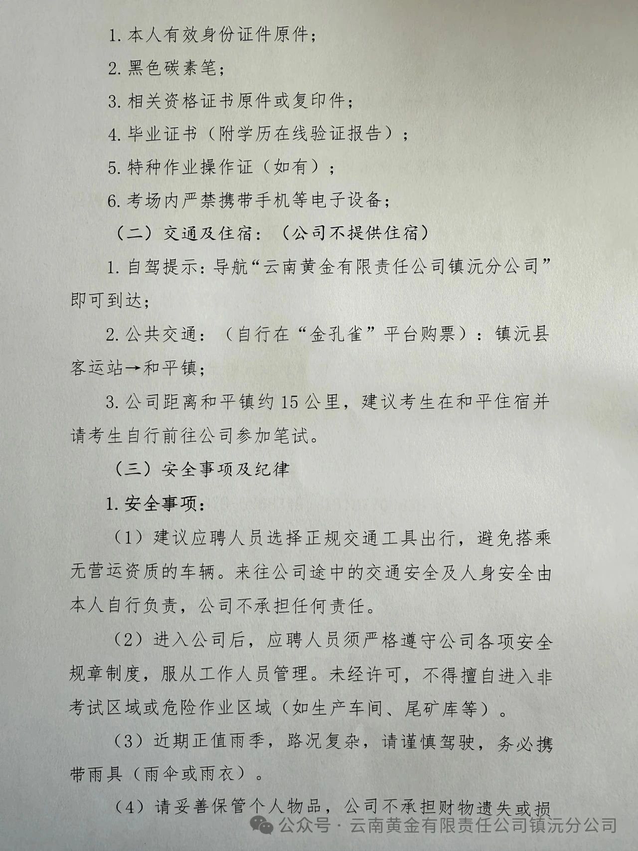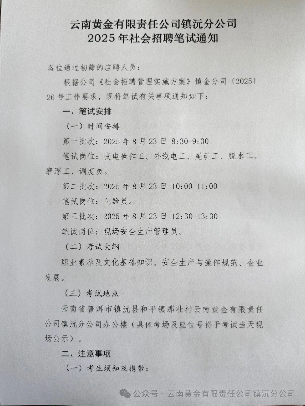 云南黃金有限責任公司鎮(zhèn)沅分公司2025年社會招聘筆試通知