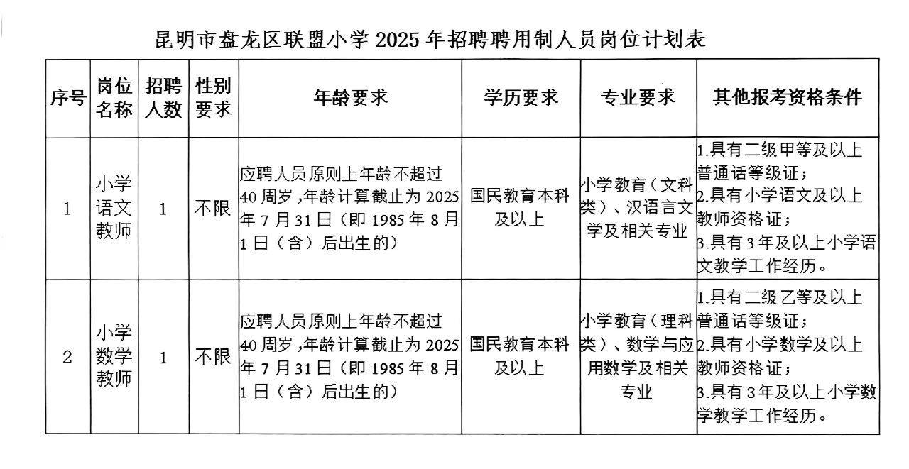 昆明市盤龍區(qū)聯(lián)盟小學(xué)2025年招聘聘用制教師公告