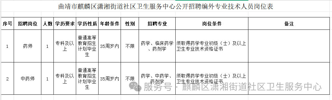本次計(jì)劃公開招聘編外藥學(xué)人員2名,具體職位及條件詳見《附件1.曲靖市麒麟?yún)^(qū)瀟湘街道社區(qū)衛(wèi)生服務(wù)中心公開招聘編外專業(yè)技術(shù)人員崗位表》(以下簡(jiǎn)稱“附件1”)。