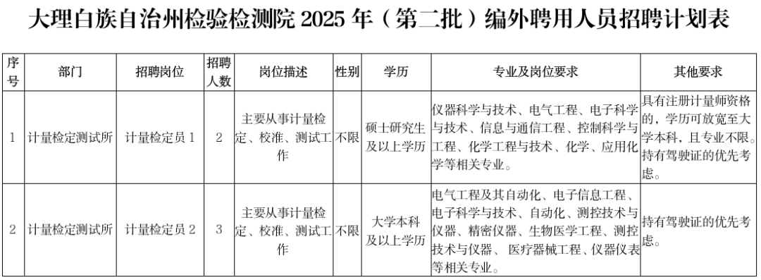 招聘崗位及招聘條件詳見(jiàn)《大理白族自治州檢驗(yàn)檢測(cè)院2025年(第二批)編外聘用人員招聘計(jì)劃表》(詳見(jiàn)附件1)。