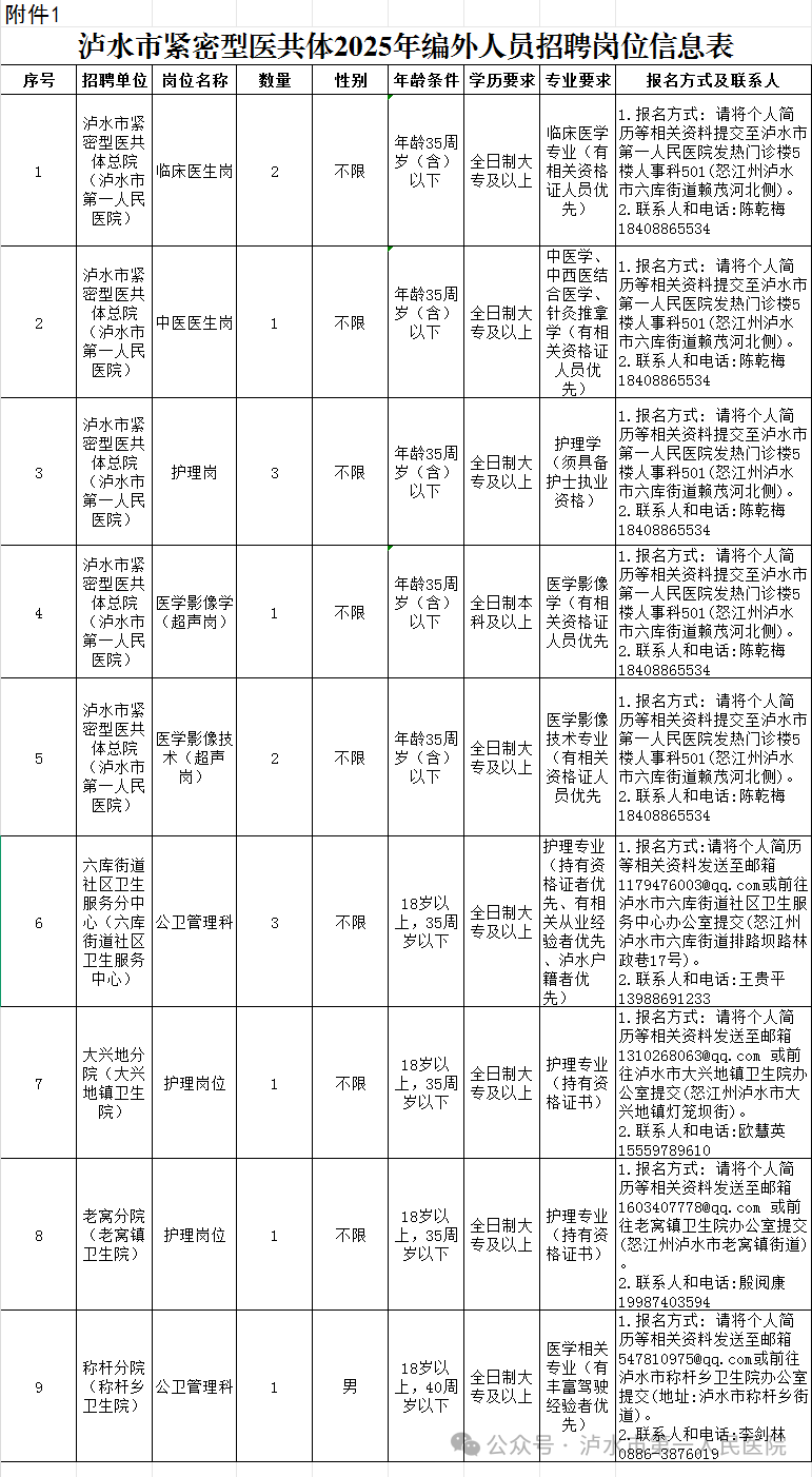 2.分院現(xiàn)場/線上報(bào)名:詳見《瀘水市緊密型醫(yī)共體2025年編外人員招聘崗位信息表》。