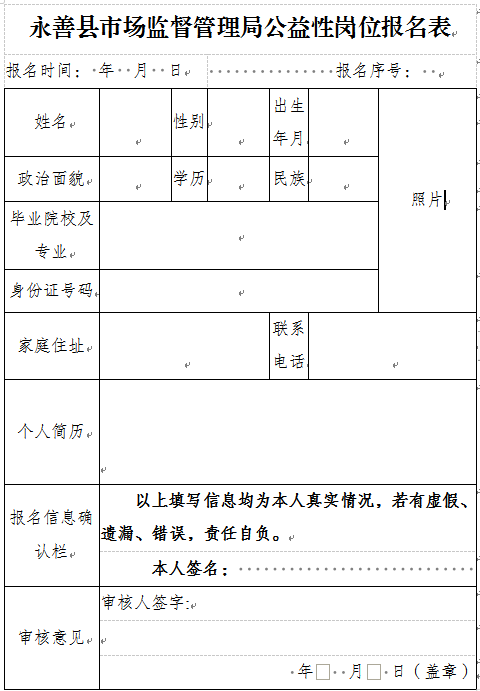 公益性崗位報(bào)名表請(qǐng)點(diǎn)擊下載:永善縣市場(chǎng)監(jiān)督管理局公益性崗位報(bào)名表.docx