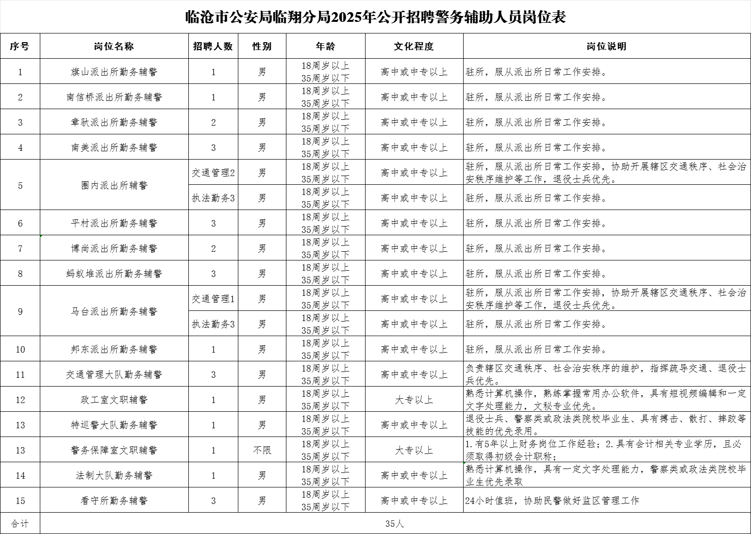 招聘人數(shù):35人。具體崗位詳見《臨滄市公安局臨翔分局2025年公開招聘警務(wù)輔助人員崗位表》(附件)。
