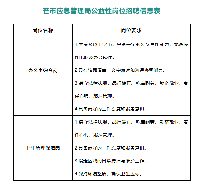 芒市應急管理局因工作需要,現(xiàn)向社會公開招聘公益性崗位人員2名,具體事項告知如下。
