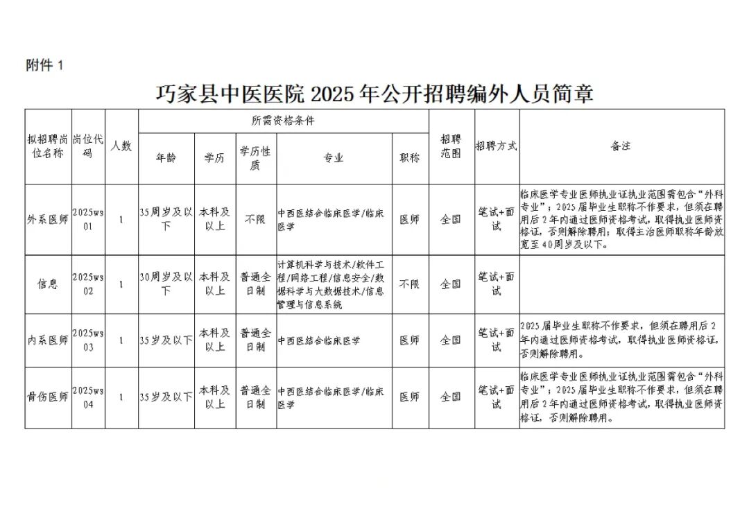 (一)崗位設置:詳見附件《巧家縣中醫(yī)醫(yī)院2025年公開招聘編外人員簡章》。