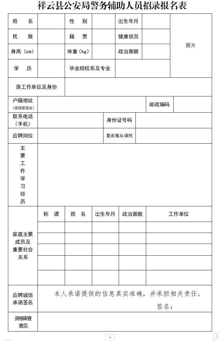 4.報名材料:(1)《祥云縣公安局警務輔助人員招錄報名表》1份(附照片);