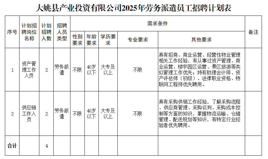 大姚縣產(chǎn)業(yè)投資有限公司全資子公司大姚風(fēng)馳供應(yīng)鏈管理有限公司因業(yè)務(wù)發(fā)展需要,經(jīng)研究,決定面向社會公開招聘勞務(wù)派遣工作人員,現(xiàn)將有關(guān)事項(xiàng)公告如下。