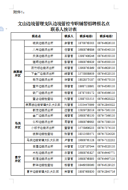 1.麻栗坡片區(qū):應(yīng)聘人員可以到麻栗坡邊境管理大隊部或所轄就近的董干、鐵廠、楊萬、八布、猛硐、天保、下金廠、城關(guān)、茨竹壩邊境派出所,董占邊境檢查站進行現(xiàn)場報名。