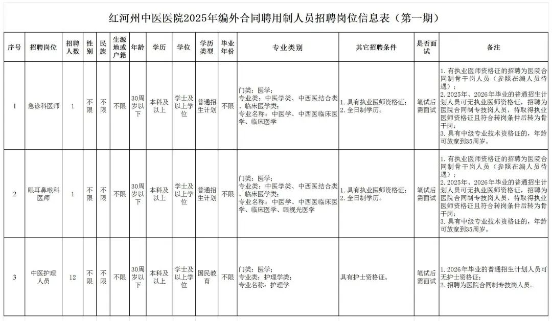 紅河州中醫(yī)醫(yī)院2025年編外合同聘用制人員招聘公告(第一期)