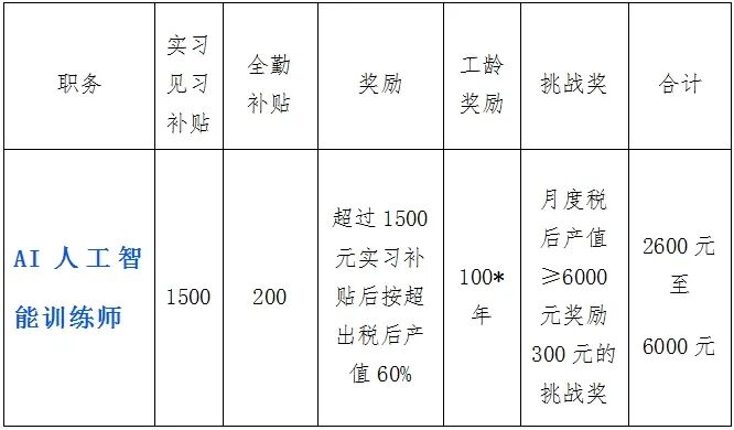 綜合薪資: 2600元-6000 元,實(shí)習(xí)見(jiàn)習(xí)補(bǔ)貼1500元+全勤補(bǔ)貼200元+績(jī)效獎(jiǎng)勵(lì)(超過(guò)1500元實(shí)習(xí)補(bǔ)貼后按超出稅后產(chǎn)值的60%計(jì)提)+工齡獎(jiǎng)勵(lì)100元/年+月度挑戰(zhàn)獎(jiǎng)300元,轉(zhuǎn)正后簽訂正式勞動(dòng)合同,購(gòu)買(mǎi)社保。