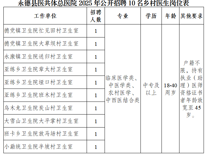 (四)符合《永德縣醫(yī)共體總醫(yī)院2025年公開招聘10名鄉(xiāng)村醫(yī)生崗位表》具體要求。