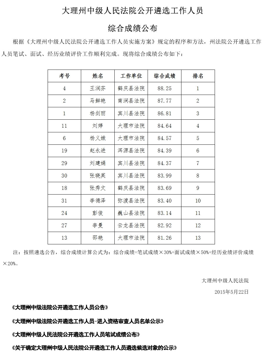 大理州中級(jí)人民法院2015年遴選人員綜合成績(jī)公示
