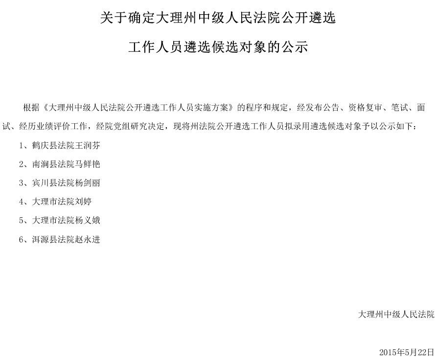 大理州中級(jí)人民法院2015年遴選人員擬遴選人員公示