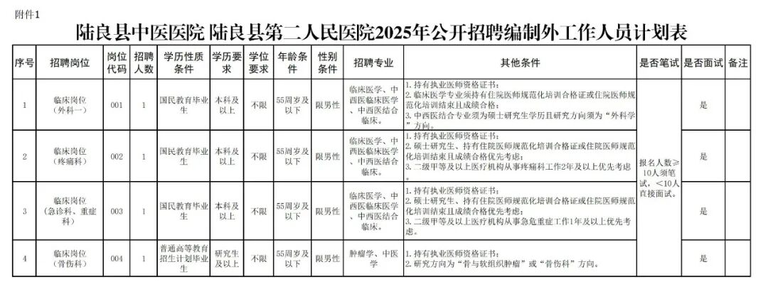 (二)招聘崗位和人數(shù)及資格條件詳見附件1《陸良縣中醫(yī)醫(yī)院 陸良縣第二人民醫(yī)院2025年公開招聘編制外工作人員計劃表》(以下簡稱“計劃表”)。