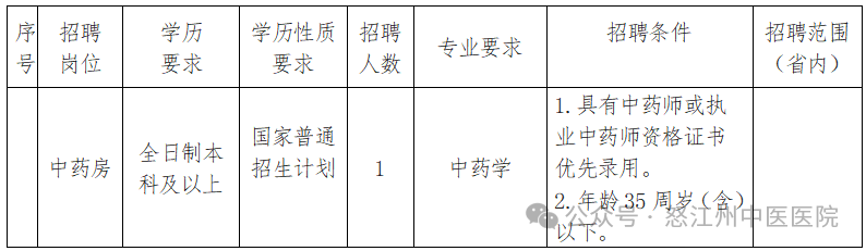 中藥房崗位:全日制本科及以上學(xué)歷,取得畢業(yè)證書(shū)、學(xué)位證(具有中藥師或執(zhí)業(yè)中藥師資格證書(shū)優(yōu)先錄用)。