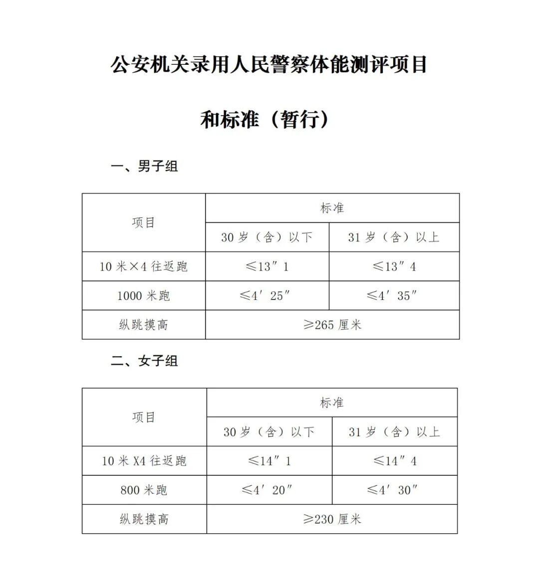測評項(xiàng)目:男子:縱跳摸高、10米×4往返跑、1000米;女子:縱跳摸高、10米×4往返跑、800米。體能測評原則上參照《公安機(jī)關(guān)錄用人民警察體能測評項(xiàng)目和標(biāo)準(zhǔn)(暫行)》(詳情見附件)執(zhí)行,合格者進(jìn)入筆試、面試環(huán)節(jié)。