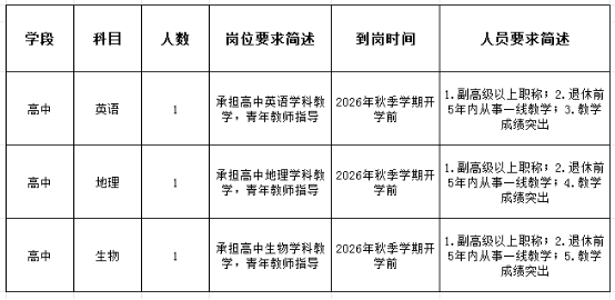 2026年秋季學(xué)期我校計(jì)劃招募云南省基礎(chǔ)教育銀齡教師3人,高中英語(yǔ)、地理、生物各1人,崗位需求詳見(jiàn)下表。