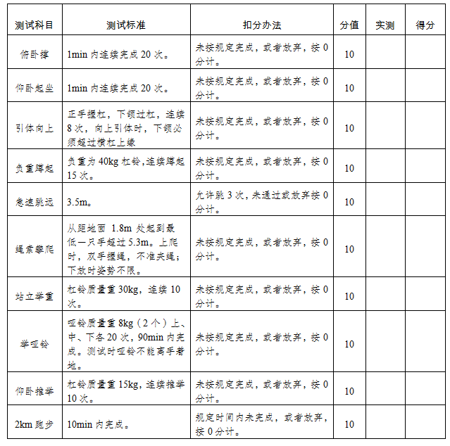 每個(gè)科目實(shí)行量化評(píng)分,并對(duì)個(gè)人綜合得分進(jìn)行量化排名,2個(gè)及以上科目得分為0分的,體能測(cè)試計(jì)為不合格。
