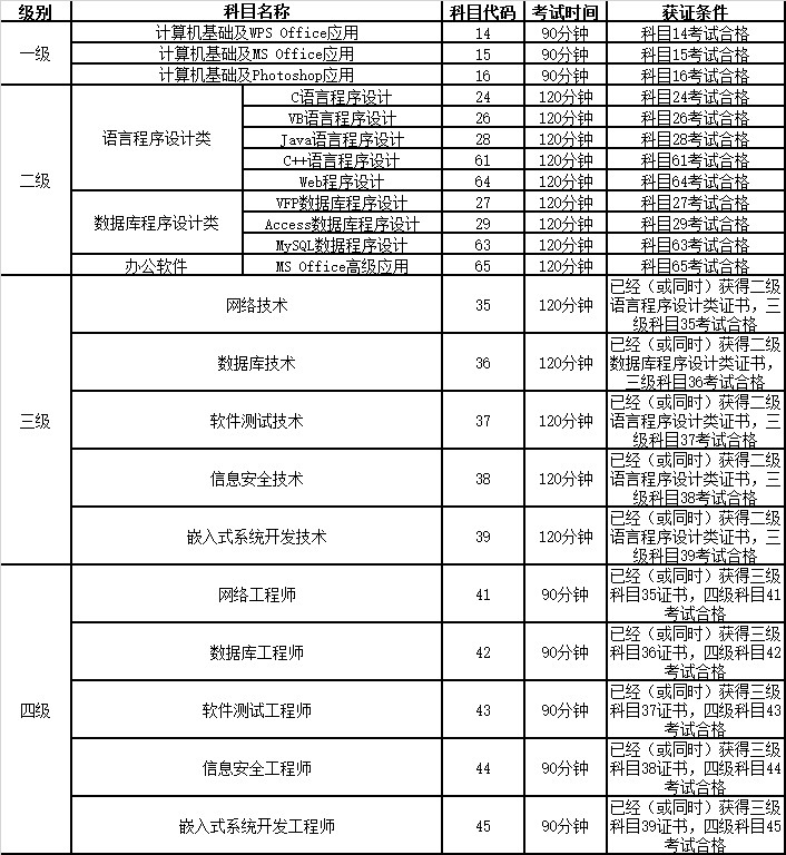 2015年下半年NCRE開(kāi)考級(jí)別及科目(2013版考試大綱)