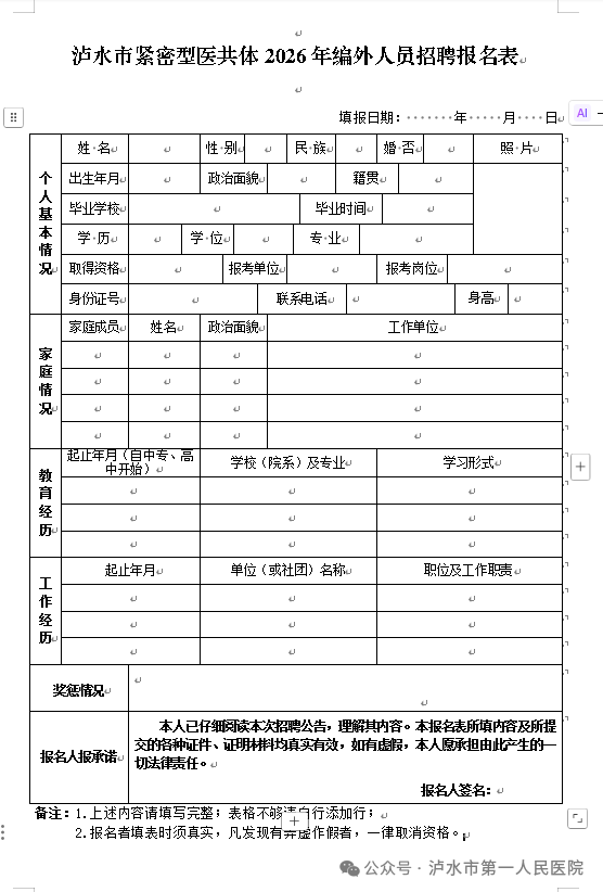 (5)《瀘水市緊密型醫(yī)共體2026年編外人員招聘報(bào)名表》;