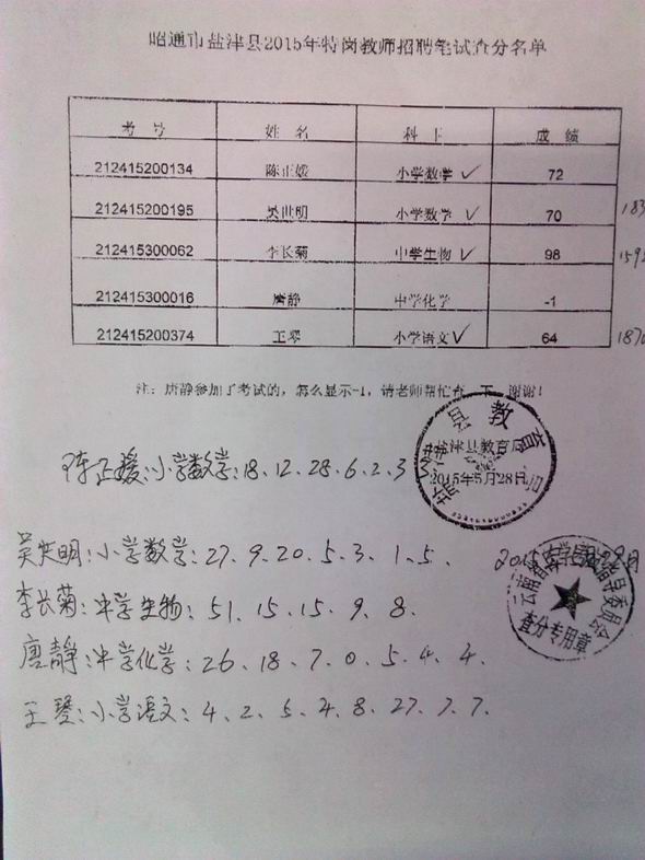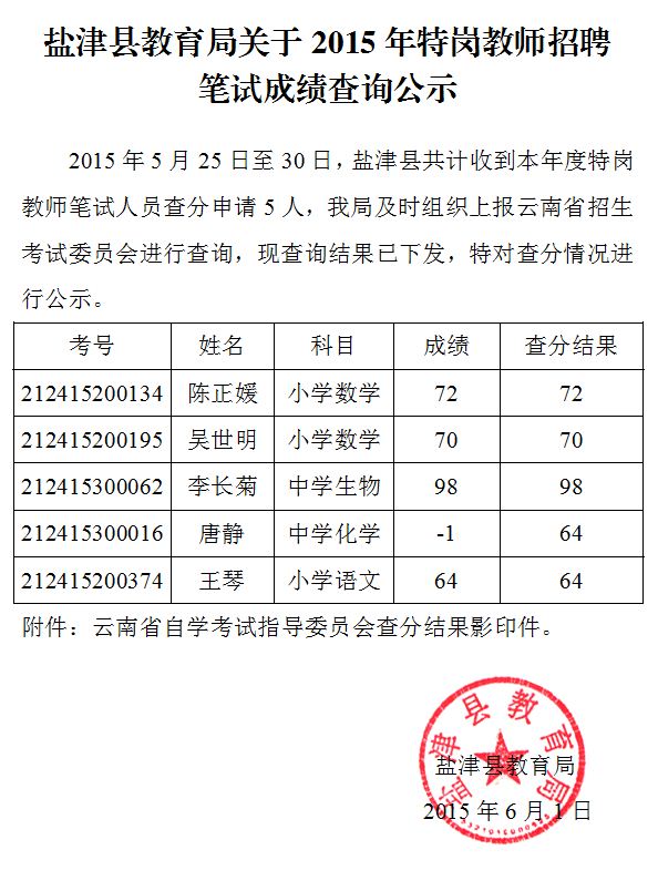 鹽津縣2015年特崗教師招聘筆試成績查詢公示