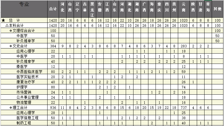 云南中醫(yī)學(xué)院2015年分省分專業(yè)(非定向)計(jì)劃總表