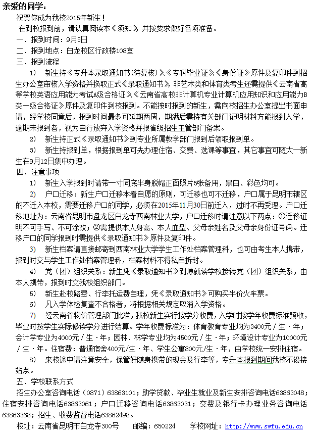 西南林業(yè)大學(xué)2015年“專升本”新生入學(xué)須知