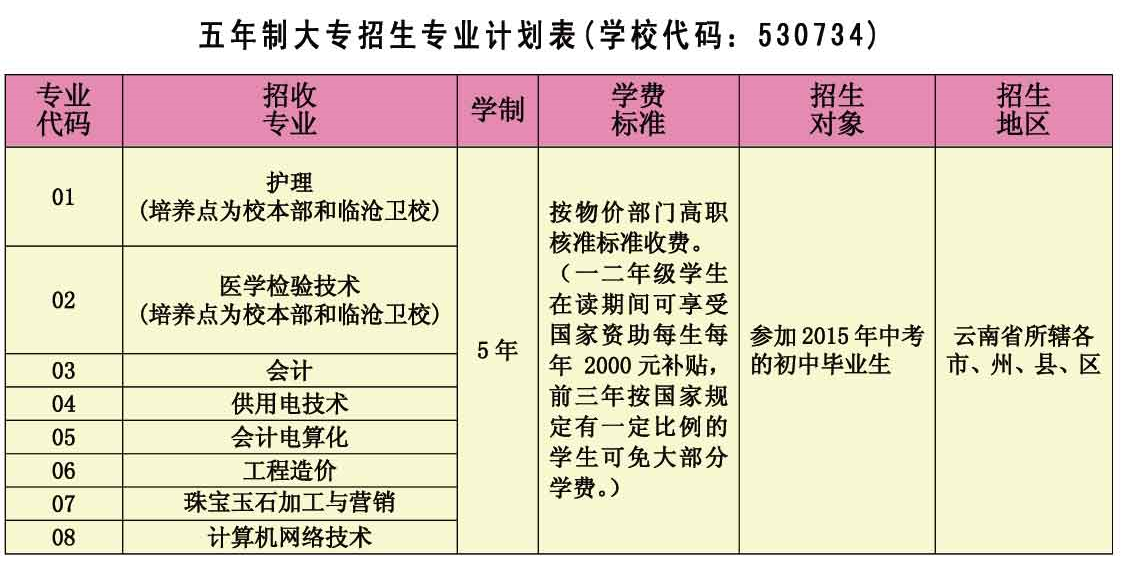 德宏職業(yè)學(xué)院2015年五年制大專招生專業(yè)計劃表