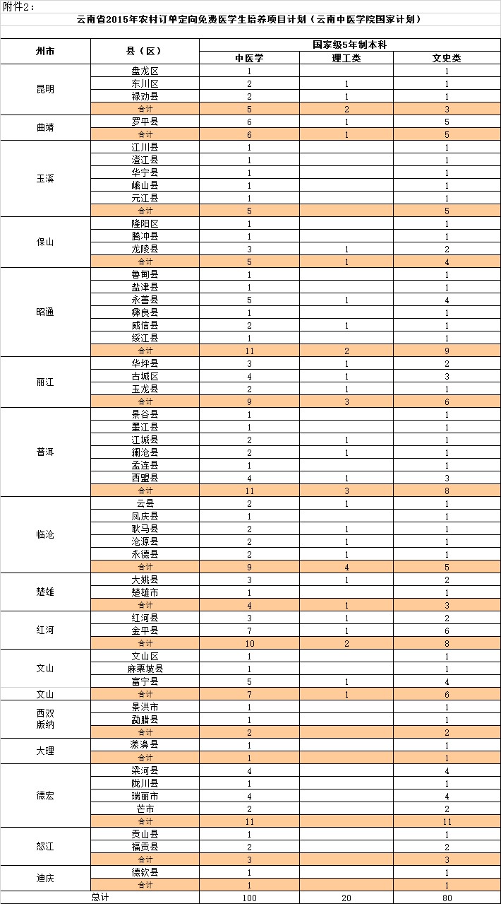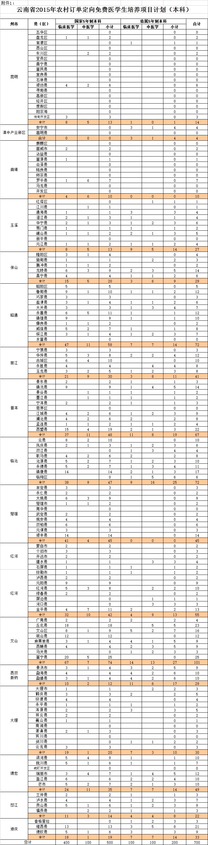 我省2015年招收免費醫(yī)學(xué)生的定向國家計劃如下:53X1昆明醫(yī)科大學(xué)臨床醫(yī)學(xué)本科150人(理工類)、53X2大理學(xué)院臨床醫(yī)學(xué)本科230人(理工類)、53X4昆明理工大學(xué)臨床醫(yī)學(xué)本科20人(理科),分縣定向計劃見《云南省2015年農(nóng)村訂單定向免費醫(yī)學(xué)生培養(yǎng)項目計劃(本科)》(附件1);53X3云南中醫(yī)學(xué)院中醫(yī)學(xué)本科100人(其中文史類80人、理工類20人),分縣定向計劃見《云南省2015年農(nóng)村訂單定向免費醫(yī)學(xué)生培養(yǎng)項目計劃(云南中醫(yī)學(xué)院國家計劃)》(附件2)